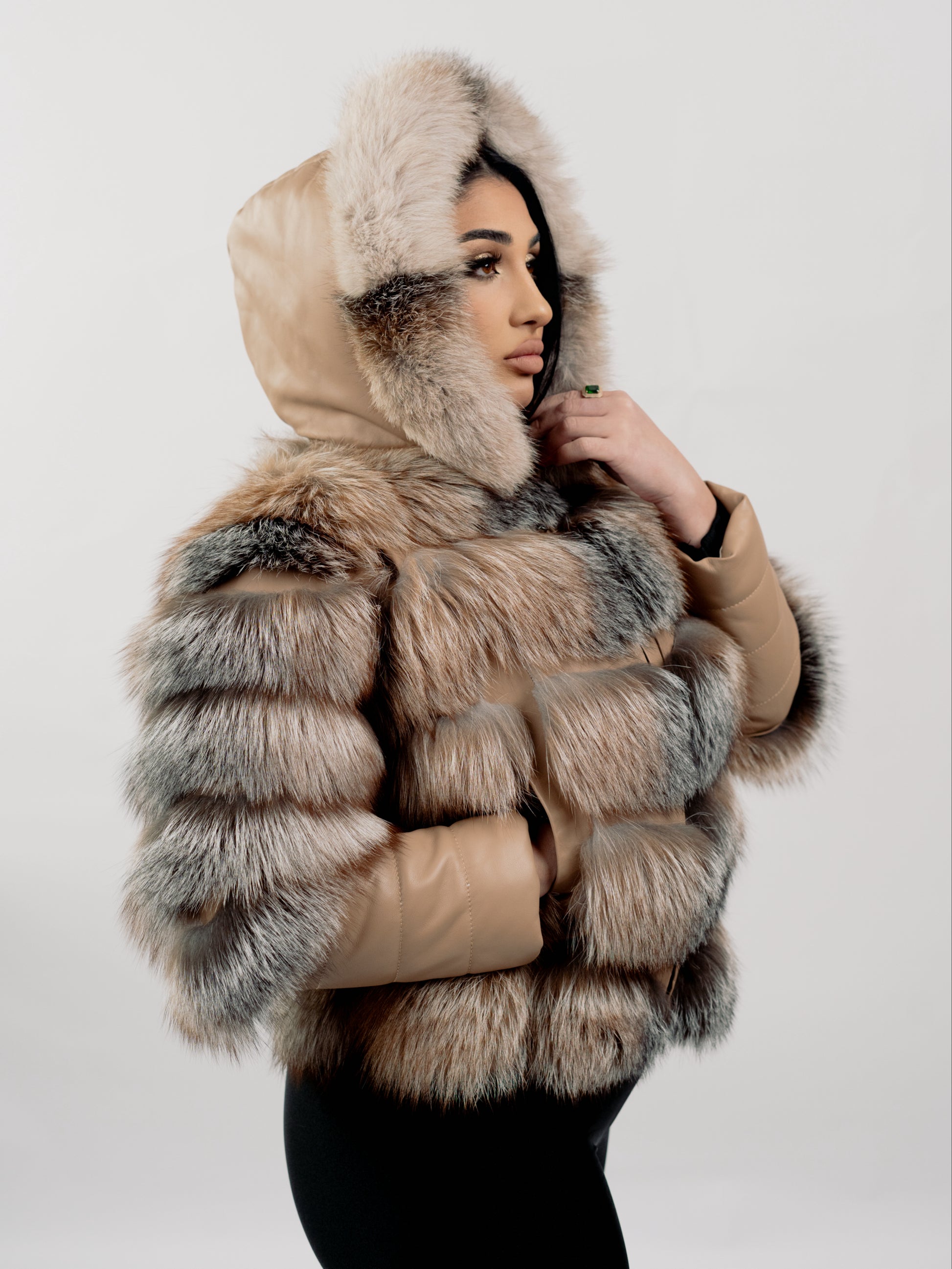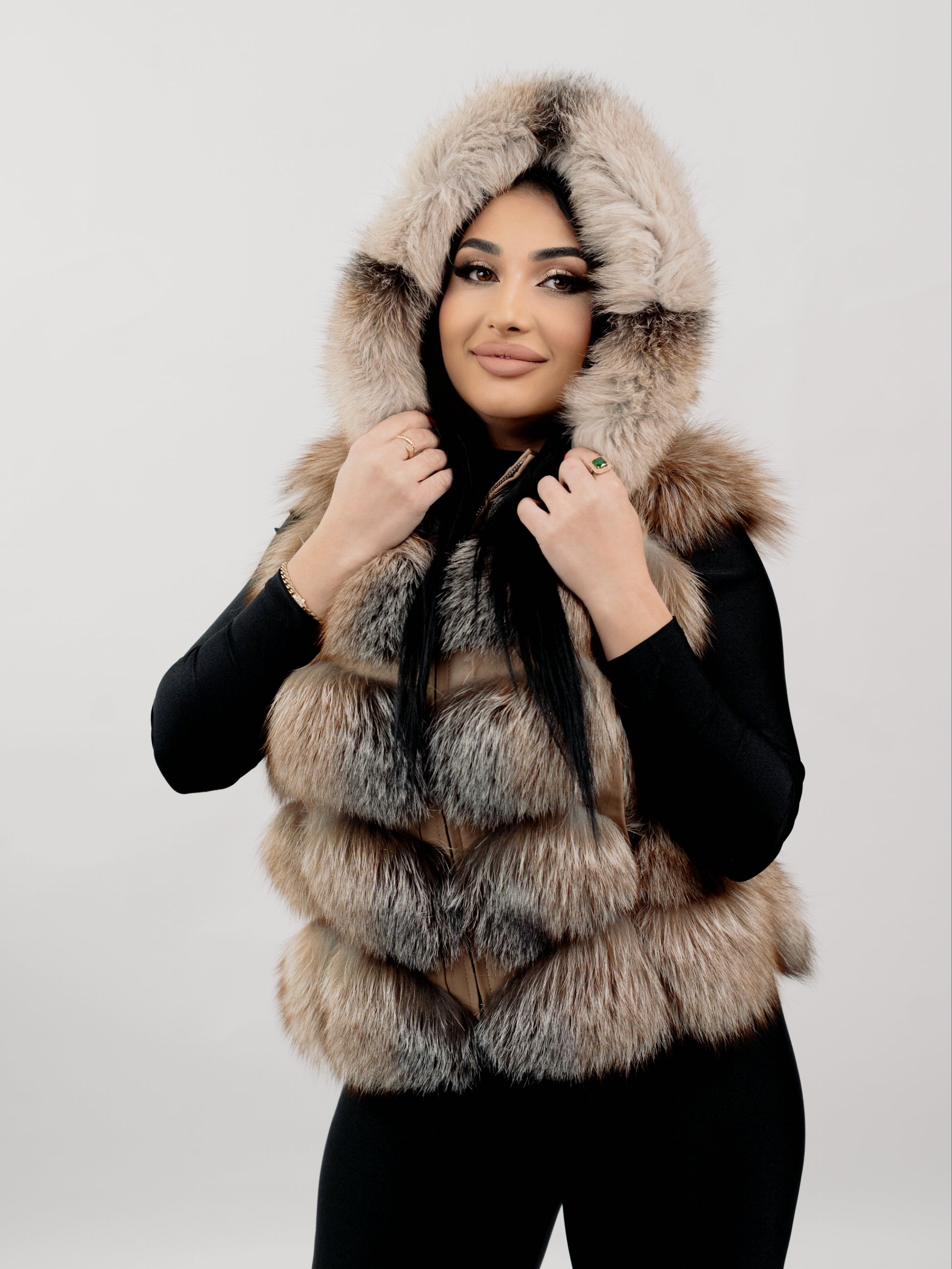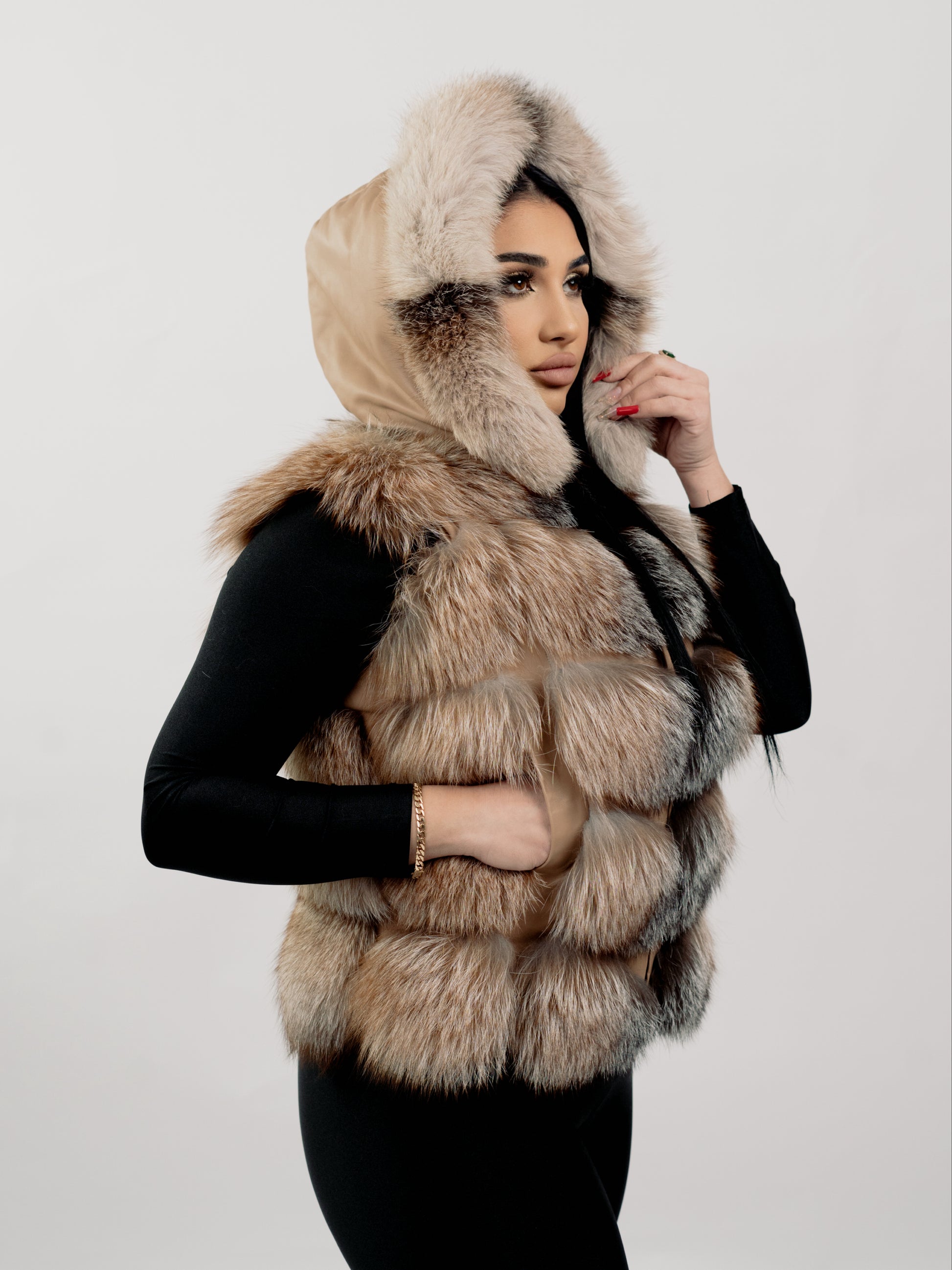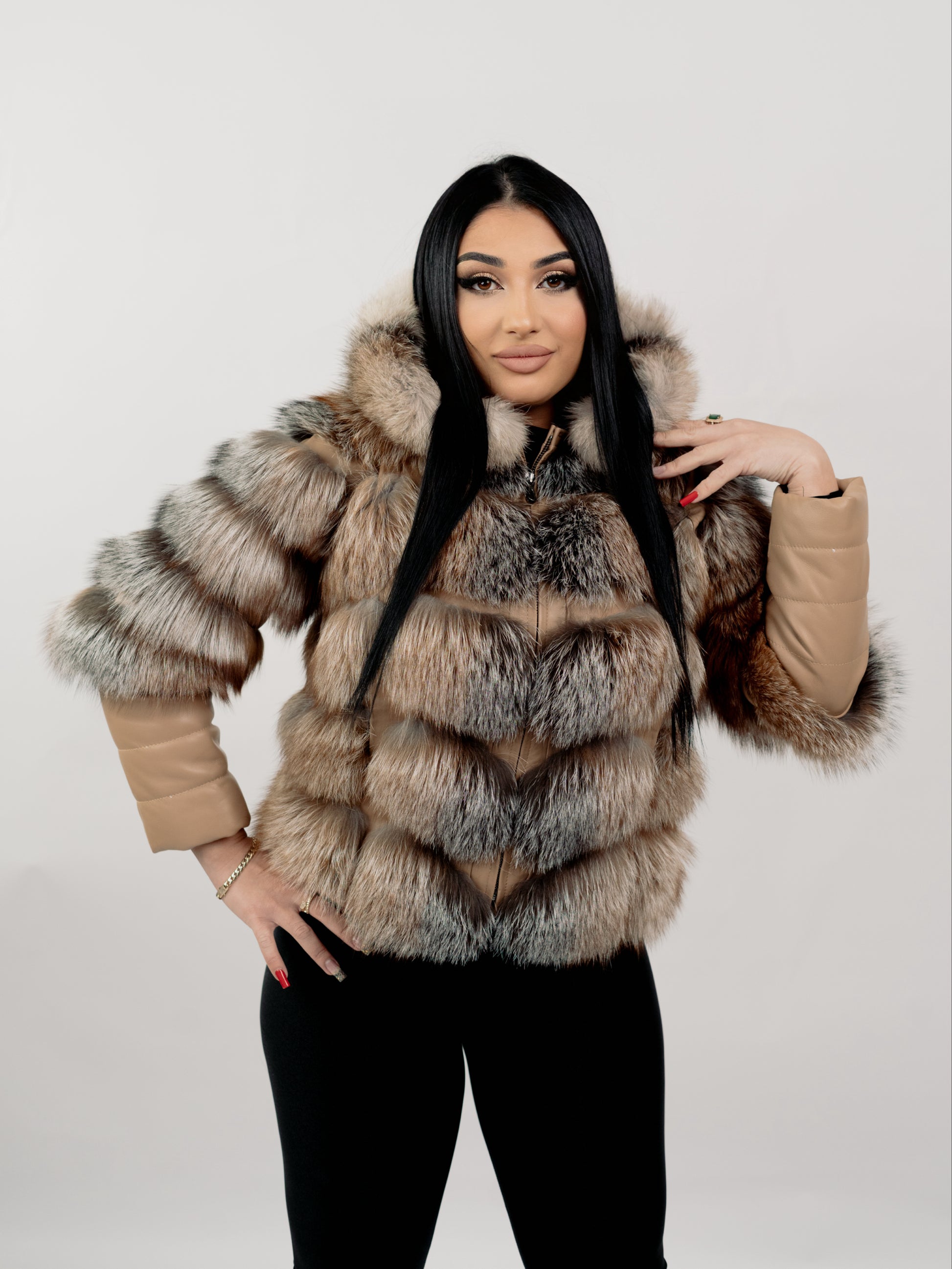 - Descoperă eleganța autentică a luxului cu haina noastră exclusivă din blană naturală de vulpe canadiană.