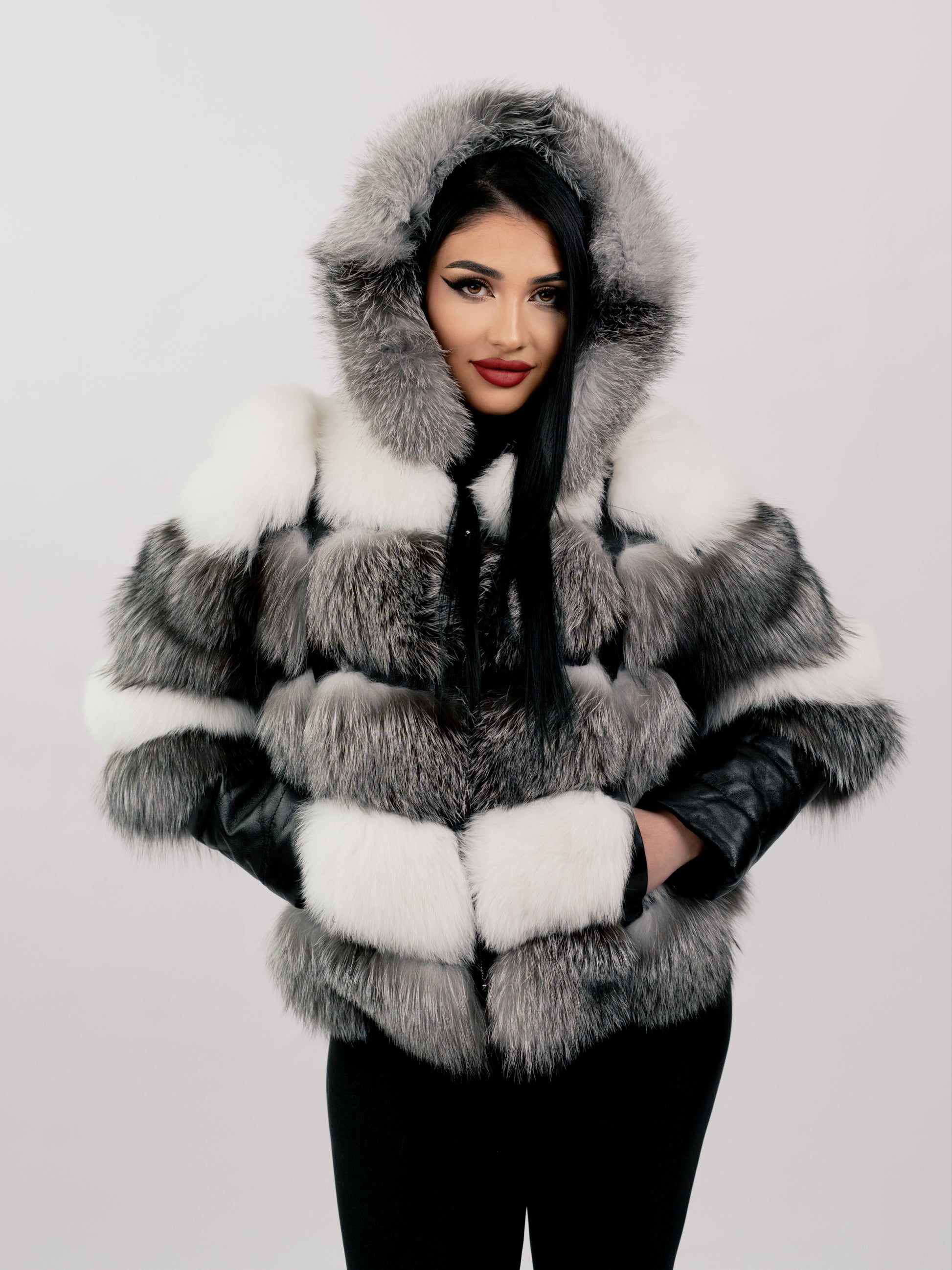 - Blana naturală de vulpe polară adaugă un plus de căldură și rafinament, iar mânecile de piele subliniază atenția la detalii și calitatea excepțională a acestui produs.